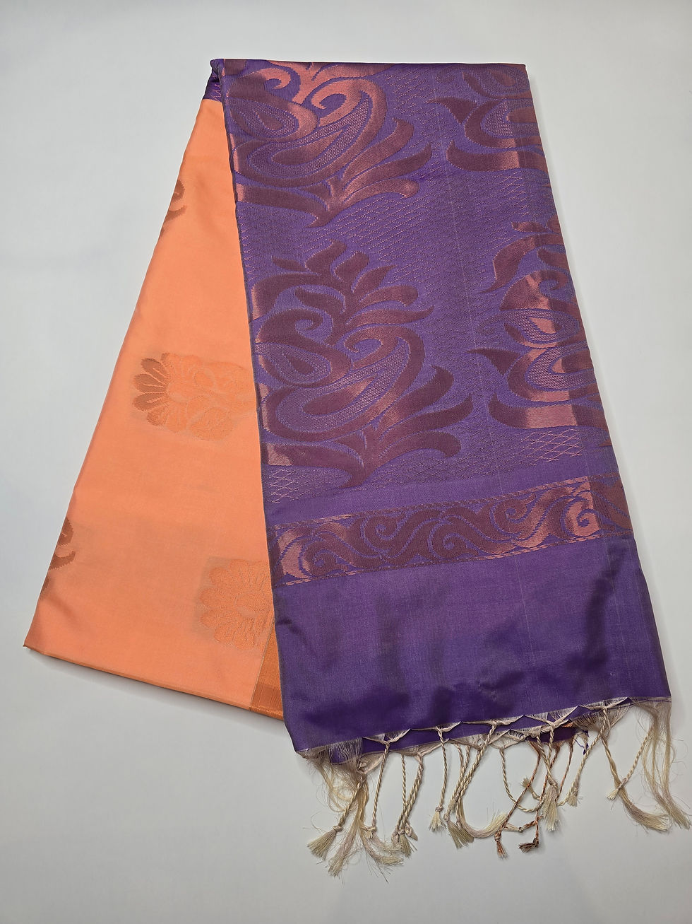 A lightweight tissue saree with artisanal guchi embroidery and authentic mirror embellishments. The onion-pink base paired with golden zari and sparkling mirrors creates a refined yet festive charm, perfect for traditional events, weddings, and evening occasions.