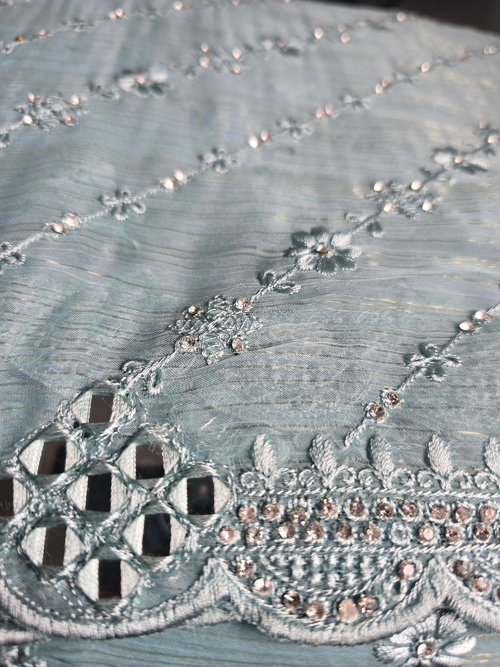 Border: Golden zari border enhanced with hand-embroidered guchi work and mirror embellishments